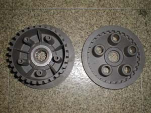 画像は、GPZ900Rのクラッチスリーブとプレッシャーディスクです。 上のドリブンプレート同様、表面硬度の向上により ドリブンプレートによる傷が付きにくくなります。 当然、熱伝導率の向上に伴い冷却も速くなります。 アルミ製のクラッチハウジングにも加工OK! |
